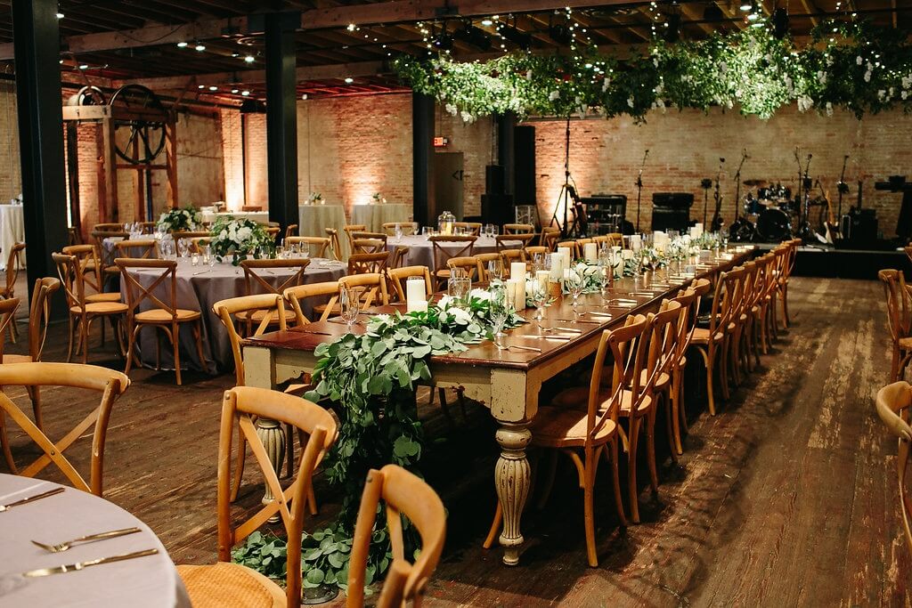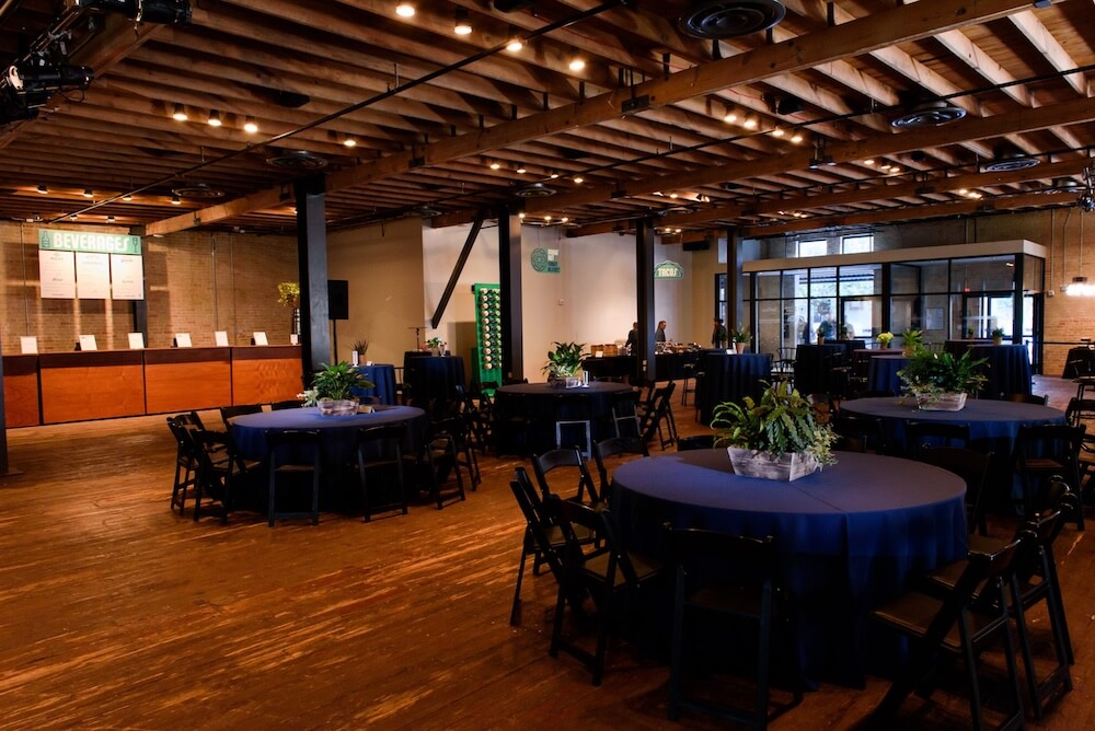 The main hall features restored pine floors, exposed brick, and tall round-top windows. Upstairs, the 3,500-square-foot rooftop deck provides skyline views ideal for cocktail hours or open-air receptions.
